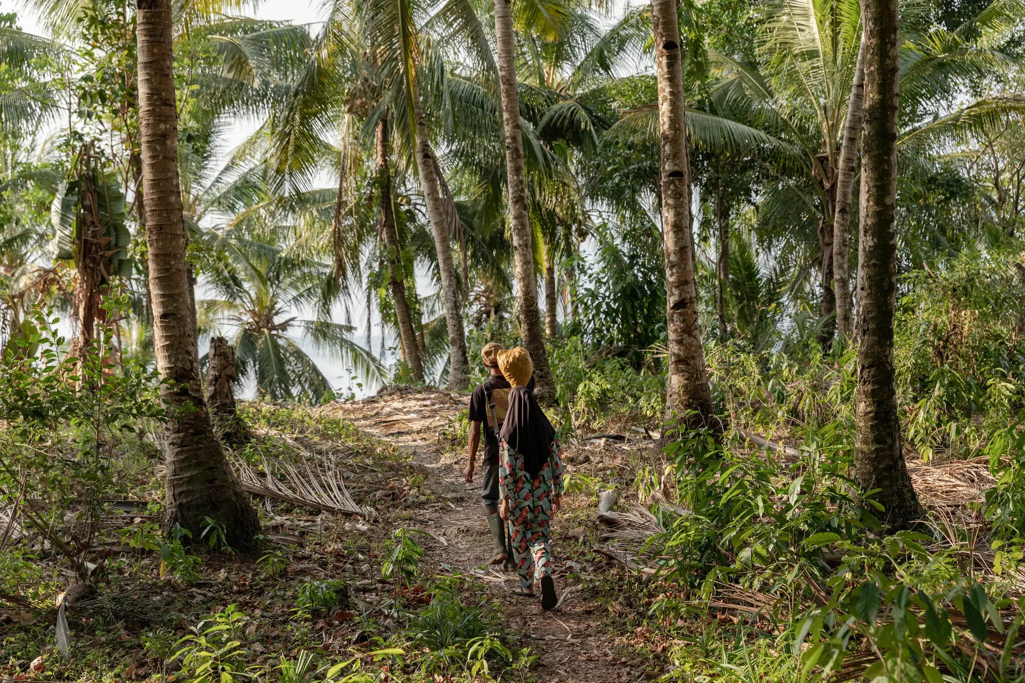 The island of Pulau Rhun is two miles long. It lies 1,600 miles east from Jakarta, the capital of Indonesia. There is no airport on the island. To access it, you must first fly to the Maluku Islands, from there take a ferry to another island called Banda Neira, and then take another smaller boat to Pulau Rhun. Two thousand people currently live on this tiny island and make their living from fishing – and still to this day — farming nutmeg. The nutmeg grows on trees in the island's forests, which cover the spit of land in a thick green blanket, dropping off before the white sand shorelines.